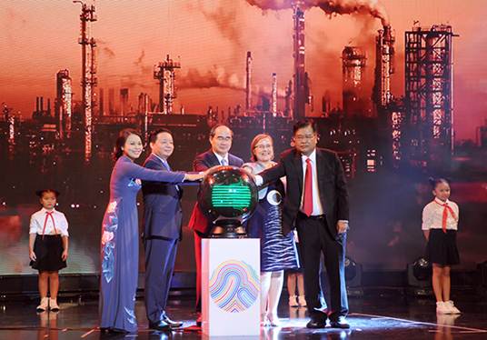 Chủ tịch MTTQ Việt Nam Nguyễn Thiện Nhân cùng Bộ trưởng Trần Hồng Hà và các đại biểu thực hiện nghi lễ phát động tháng hành động vì môi trường 2017