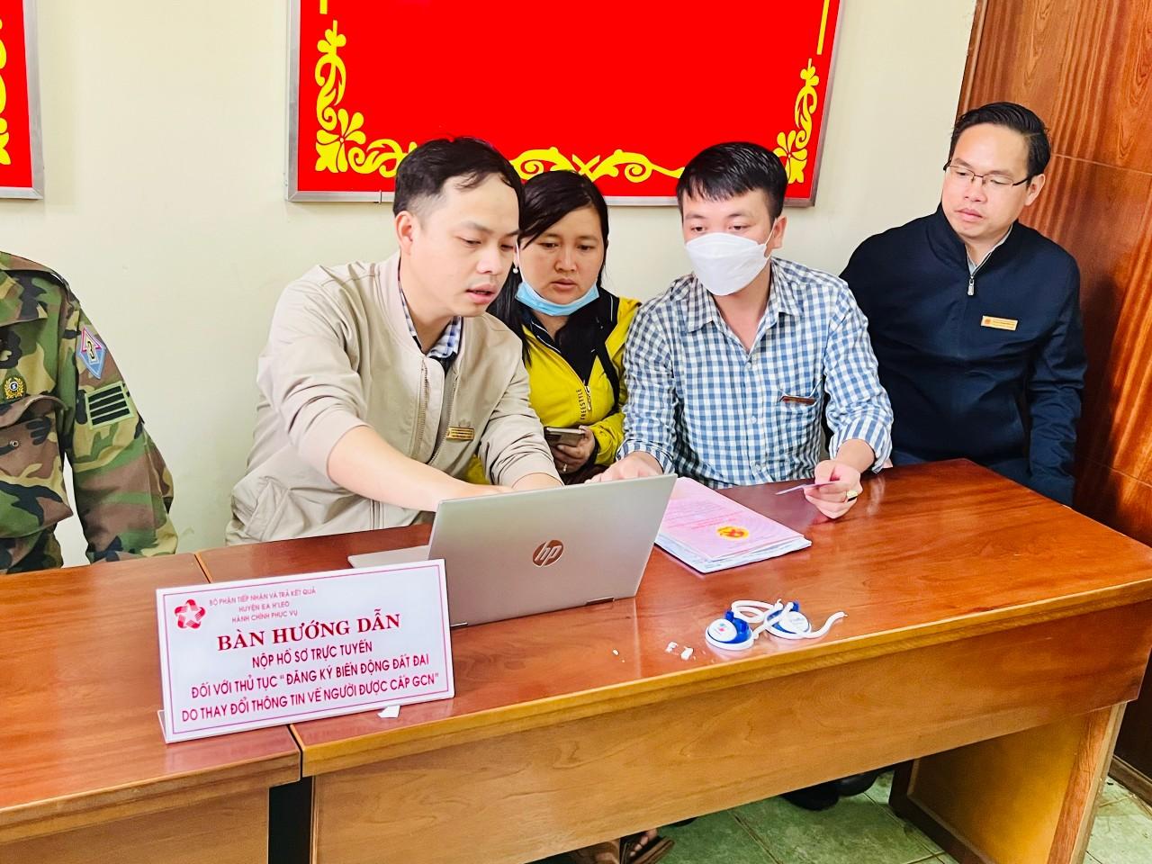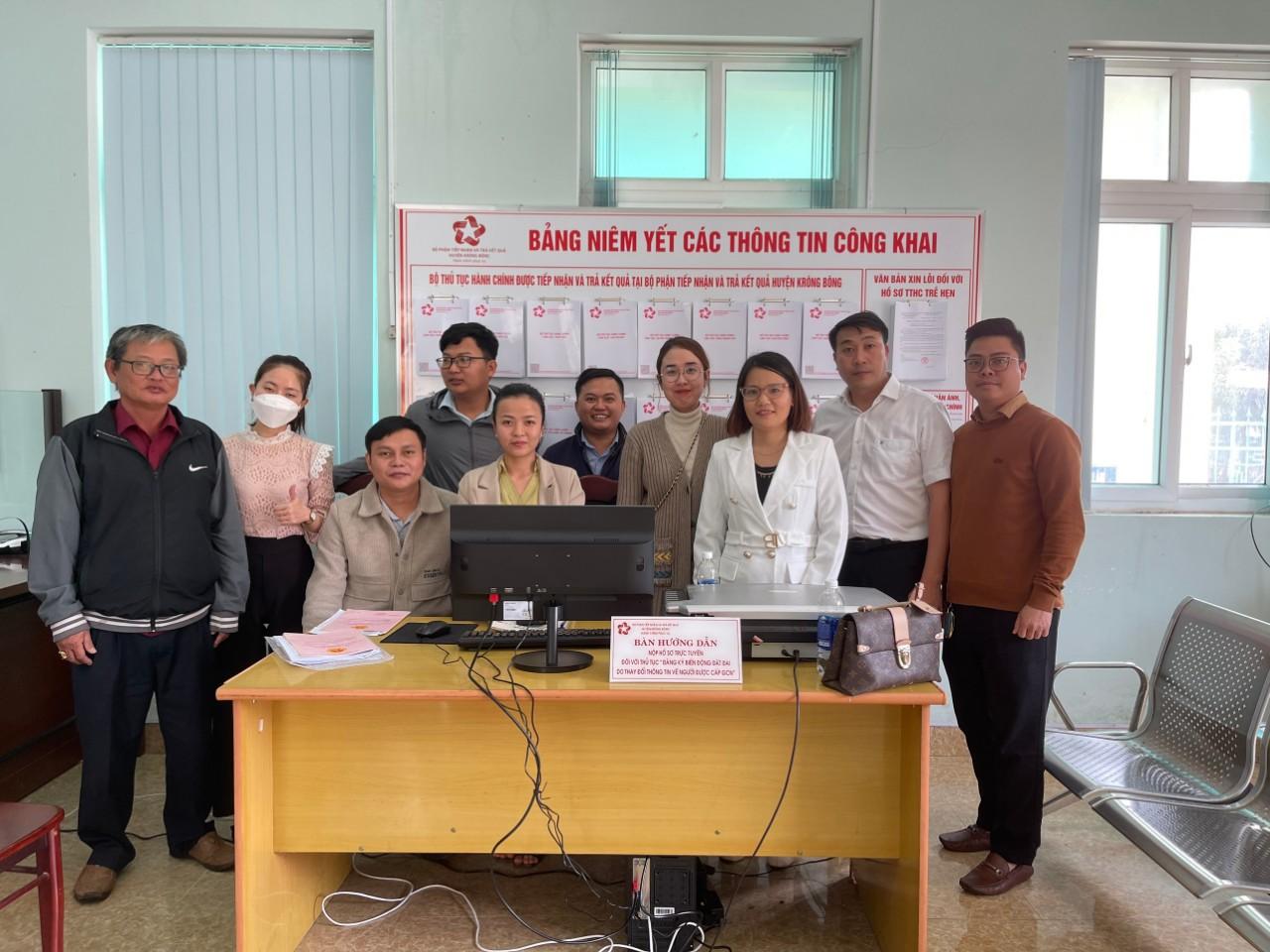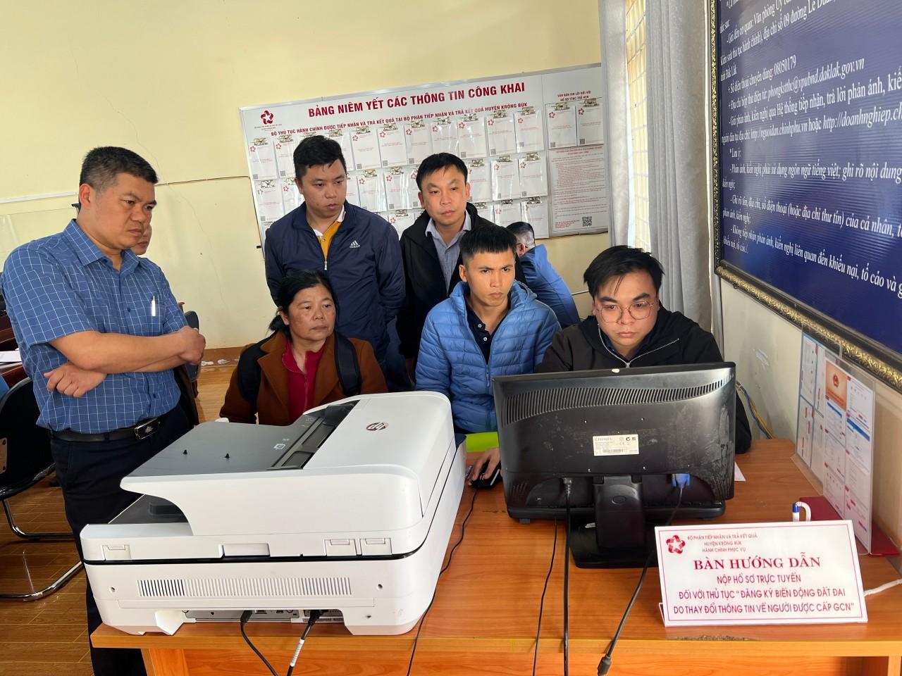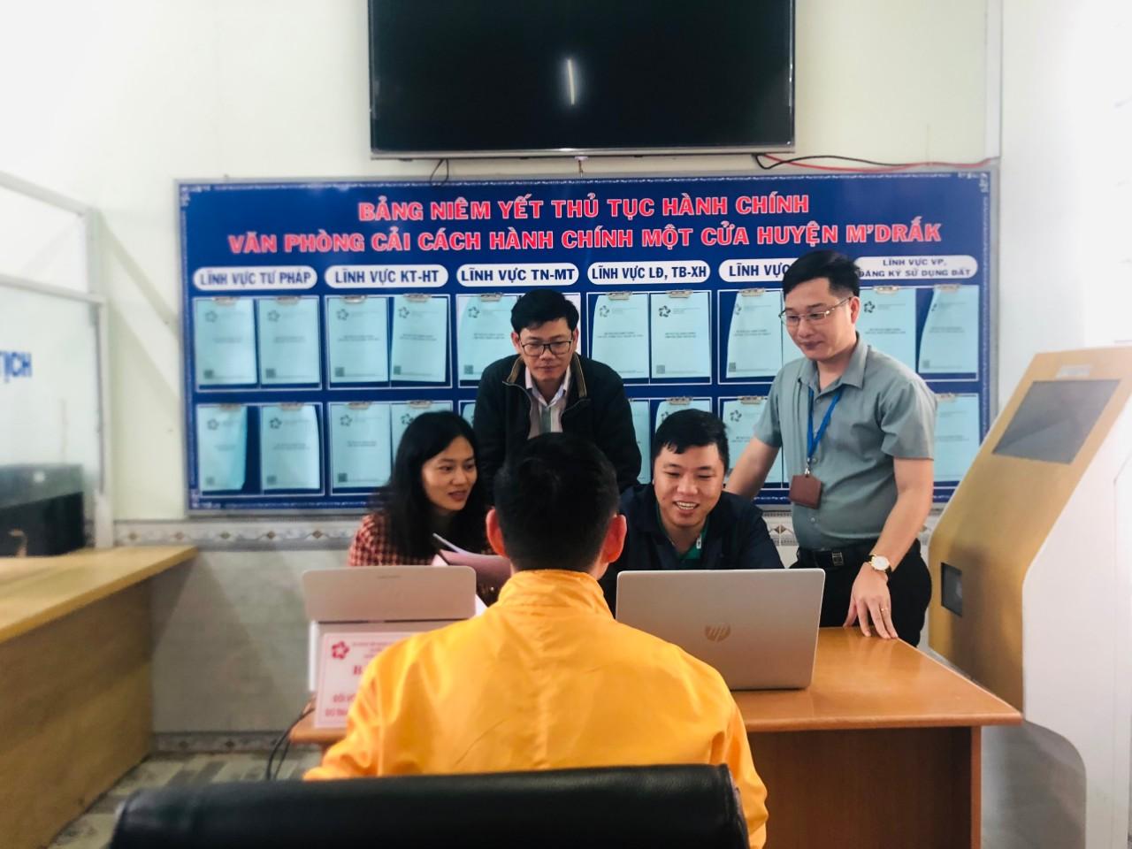 Từ ngày 09/01/2023 đến ngày 10/01/2023, Văn phòng Đăng ký đất đai tỉnh Đắk Lắk đã phối hợp với Văn phòng HĐND&UBND các huyện: Ea H’leo, Ea Kar, Krông Bông, Krông Búk, Krông Năng, Lắk và M’Drắk (là các huyện thực hiện Dự án Tăng cường quản lý đất đai và cơ sở dữ liệu đất đai) triển khai cung ứng dịch vụ công trực tuyến toàn trình đối với thủ tục hành chính số 19 “Đăng ký biến động về quyền sử dụng đất, quyền sở hữu tài sản gắn liền với đất do thay đổi thông tin về người được cấp Giấy chứng nhận (đổi tên hoặc giấy tờ pháp nhân, giấy tờ nhân thân, địa chỉ)”, thuộc Phụ lục I kèm theo Quyết định số 06/QĐ-TTg ngày 06/01/2022 của Thủ tướng Chính phủ. Theo đó, Văn phòng Đăng ký đất đai tỉnh Đắk Lắk đã thành lập Tổ Công nghệ số hỗ trợ cộng đồng để trực tiếp tuyên truyền, hỗ trợ, hướng dẫn người dân nộp hồ sơ trực tuyến thủ tục hành chính số 19 tại Bộ phận Tiếp nhận và Trả kết quả thuộc Văn phòng HĐND&UBND các huyện; trực tiếp tập huấn, hướng dẫn cho viên chức, người lao động tại Chi nhánh Văn phòng Đăng ký đất đai các huyện: Ea H’leo, Ea Kar, Krông Bông, Krông Búk, Krông Năng, Lắk và M’Drắk thực hiện tiếp nhận, giải quyết và trả kết quả hồ sơ dịch vụ công trực tuyến toàn trình đối với thủ tục hành chính số 19. Được sự hỗ trợ của UBND các huyện, sau 02 ngày triển khai, Văn phòng Đăng ký đất đai tỉnh Đắk Lắk đã hoàn thành tốt việc triển khai thực hiện nhiệm vụ nêu trên.