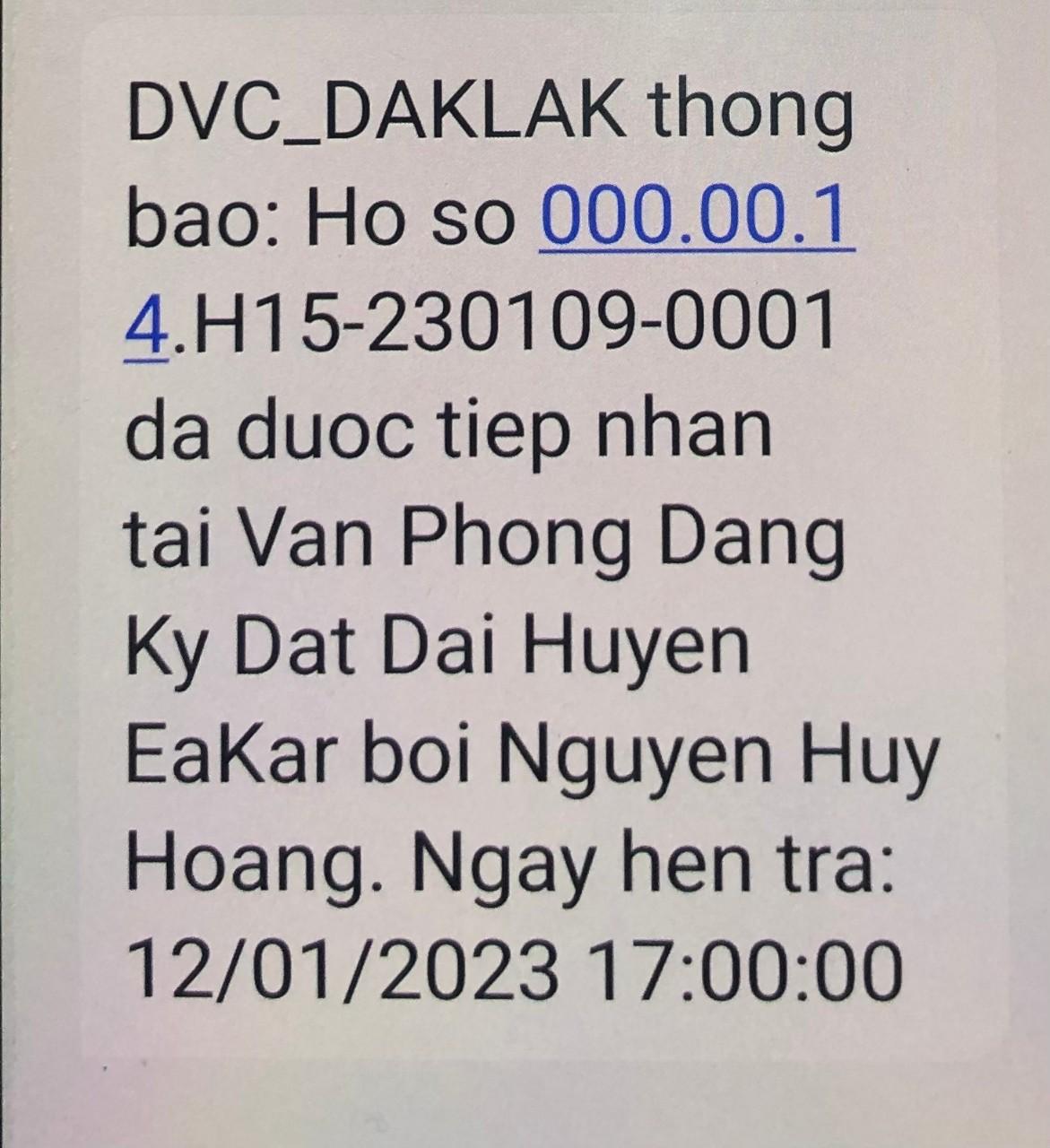 Sau khi nộp hồ sơ trực tuyến toàn trình, công dân nhận được tin nhắn của hệ thống Dịch vụ công Đắk Lắk về việc nộp hồ sơ thành công và ngày hẹn trả kết quả.