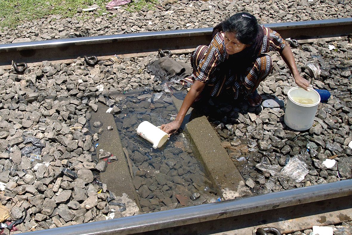 Người dân khu ổ chuột lấy nước uống từ vũng nước giữa đường ray tàu hỏa tại Mumbai - Ảnh: Reuters