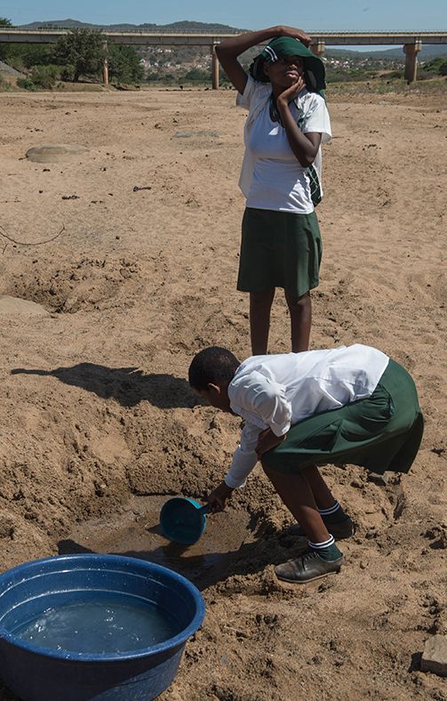 Một bé gái đang cố lấy nước từ một vũng nông tại Nongoma, phía tây bắc Durban trong đợt hạn hán ở Nam Phi - Ảnh: AFP