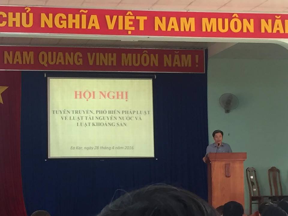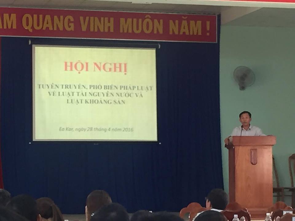Ngày 28/04/2016, Sở Tài nguyên và Môi trường đã phối hợp với UBND huyện Ea Kar tổ chức hội nghị tập huấn tuyên truyền, phổ biến pháp luật về lĩnh vực tài nguyên nước và khoáng sản cho các cán bộ, công chức, viên chức và các tổ chức, cá nhân trên địa bàn huyện. Đến dự hội nghị có đồng chí Trần Văn Hà (Chủ tịch UBND huyện) và có gần 100 đại biểu là lãnh đạo các phòng, ban chuyên môn của UBND huyện, lãnh đạo, cán bộ UBND các xã trên địa bàn huyện, cán bộ công chức, viên chức và các tổ chức, cá nhân trên địa bàn huyện.