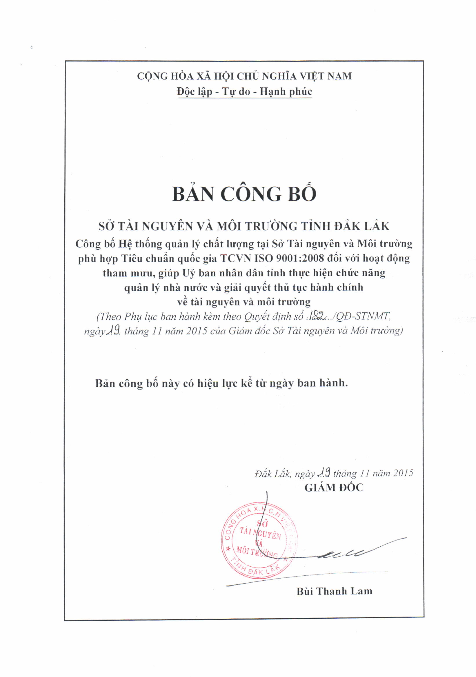 Ngày 19/11/2015, Giám đốc Sở Tài nguyên và Môi trường tỉnh Đắk Lắk đã ký Quyết định v/v Công bố Hệ thống quản lý chất lượng phù hợp với Tiêu chuẩn quốc gia TCVN 9001:2008. Theo đó, Sở Tài nguyên và Môi trường tỉnh Đắk Lắk công bố Hệ thống quản lý chất lượng phù hợp với Tiêu chuẩn quốc gia TCVN 9001:2008 theo quy định tại Quyết định số 19/2014/QĐ-TTg của Thủ tướng Chính phủ đối với các lĩnh vực hoạt động như lĩnh vực đất đai, đo đạc và bản đồ, địa chất và khoáng sản, tài nguyên nước - khí tượng thủy văn, giải quyết khiếu nại - tố cáo. Quyết định này có hiệu lực kể từ ngày ký ./.