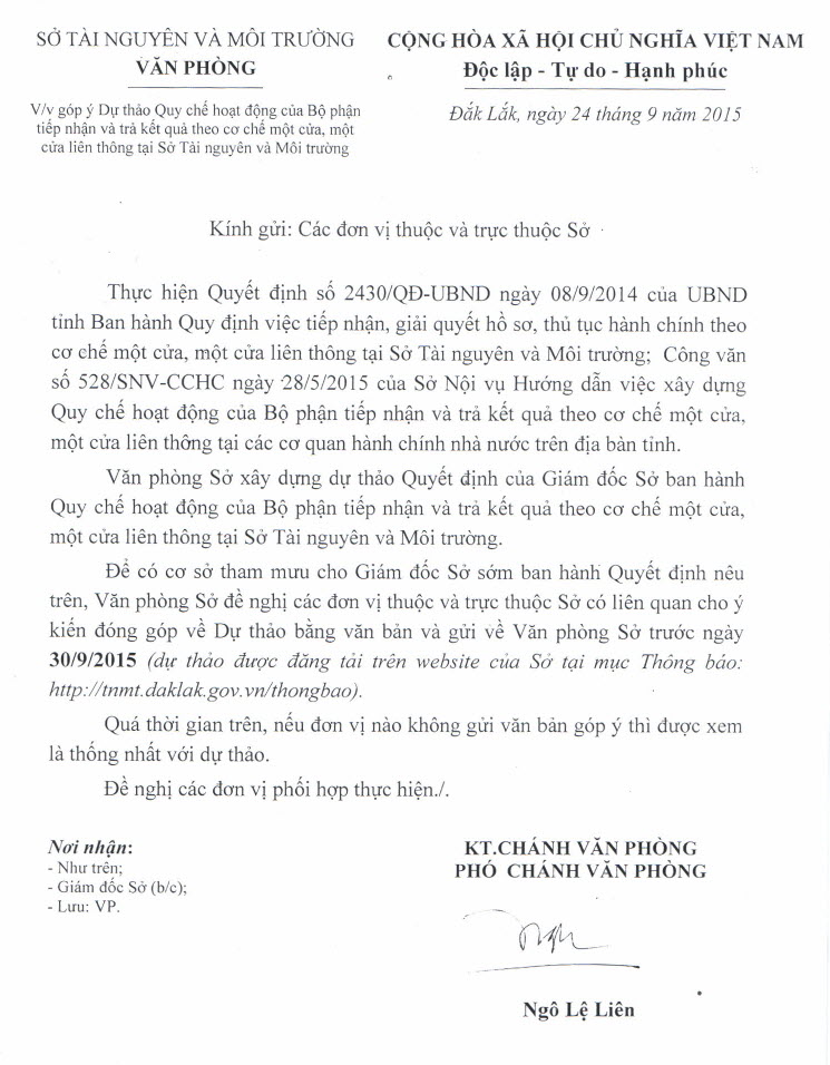 V/v góp ý Dự thảo Quy chế hoạt động của Bộ phận tiếp nhận và trả kết quả theo cơ chế một cửa, một cửa liên thông tại Sở Tài nguyên và Môi trường